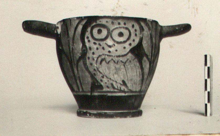 | Description: | Glaux Skyphos. Corinthian imitation. Intact, save small chips. A and B, owl to left; head in front, between two sprays; circle and dot on bottom. Very dull glaze, grayish and somewhat peeled; red wash on the reserved portions. Pale buff clay. ADDENDA Not Attic; probably not from the Agora. | |