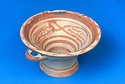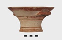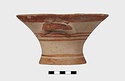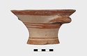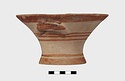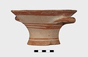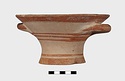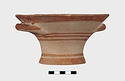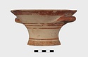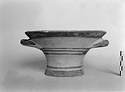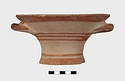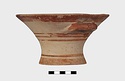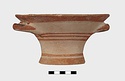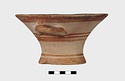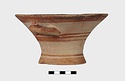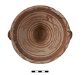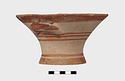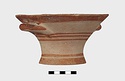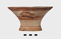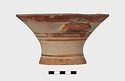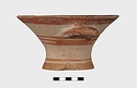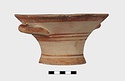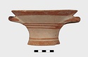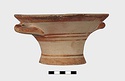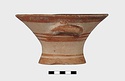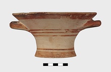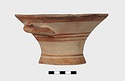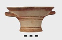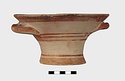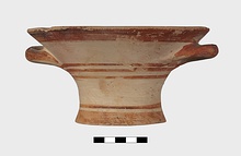 Description:   Intact, except for chips. Flat-bottomed pot wth flaring concave sides resembling a kalathos. Plain rim, flat on top. Two short horizontal handles attached below rim.