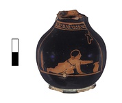 Figured panel bordered above by egg pattern; at sides and below by plain reserved line. Small boy, naked except for amulet, crawls right, his left hand outstretched towards a jug standing on the floor. Behind him a streptos cake set in the ground; above the jug, a grape cluster.