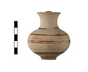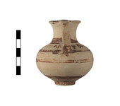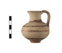 | Description: | Intact. One-handled miniature jug with fairly wide mouth, sharply bulging body, narrow foot. Decoration in bands around rim, neck-shoulder join, point of greatest diameter and foot; wavy zigzag pattern on shoulder. Yellowish-buff clay; brown glaze. LH(III A 2)-B | |
