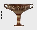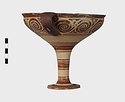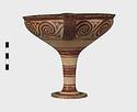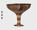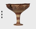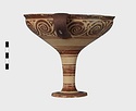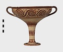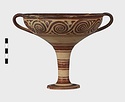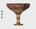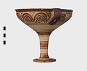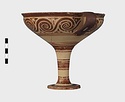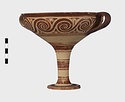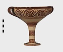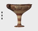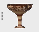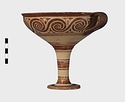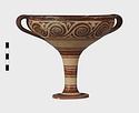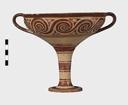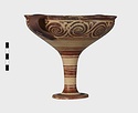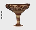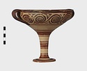 | Description: | Mended from seven pieces; complete except for one handle. Narrow lip out-turned and offset; bowl rounded, relatively deep; band handles scarcely rising above rim; tall slender stem; broad foot with circular depression at center beneath. Lip glazed inside and out; handle glazed outside. Decoration in main zone: double interlocking running spiral with triangular filling ornament above two sets of three narrow bands. Banded stem; one broad and one narrow band, then a broad band between two narrow; and another narrow and broad. The upper part of the foot banded; the edge and outer face glazed. Pale buff clay, smooth lighter buff slip; red-brown glaze, slightly streaked. Amarna parallels for spiral; early 14th c. B.C. Cf. Archaeology 4 (1951) pp. 224-225 for pattern. | |