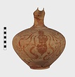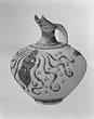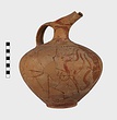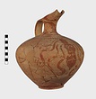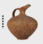 | Description: | Jug with Beaked Spout. Fragments of wall and spout missing; mended from many pieces. Broad ovoid body; low raised base. Narrow neck concave in profile, set off from the shoulder by a pronounced ridge. Elongated spout-mouth with plain rim, the spout tapering towards the narrow pouring end. Band handle from rim, broad and with a median rib which ends in a blunt point projecting from the lower attachment. A small hole is pierced through from below this point to the inner face of the handle; for hanging? Spout, neck and handle glazed; the foot glazed solid beneath a narrow stripe. Below the shoulder ridge, ring of oval dots. Decoration covering the body: at front, beneath spout, a large cuttlefish/octopus facing; the eyes reserved, with circular pupil-dots. Four long stylized tentacles curl down from the crown, on either side; scattered dot and curlique filling ornament. High on the body on either side, a dolphin-like fish, facing towards the cuttlefish/octopus; the eye reserved with circular pupil dot; double-stroke tails. Red-buff clay; smooth light buff slip; red to light brown glaze, badly worn. ***4 sherds left from reconstruction in Study Collections Case No. 19-2. | |