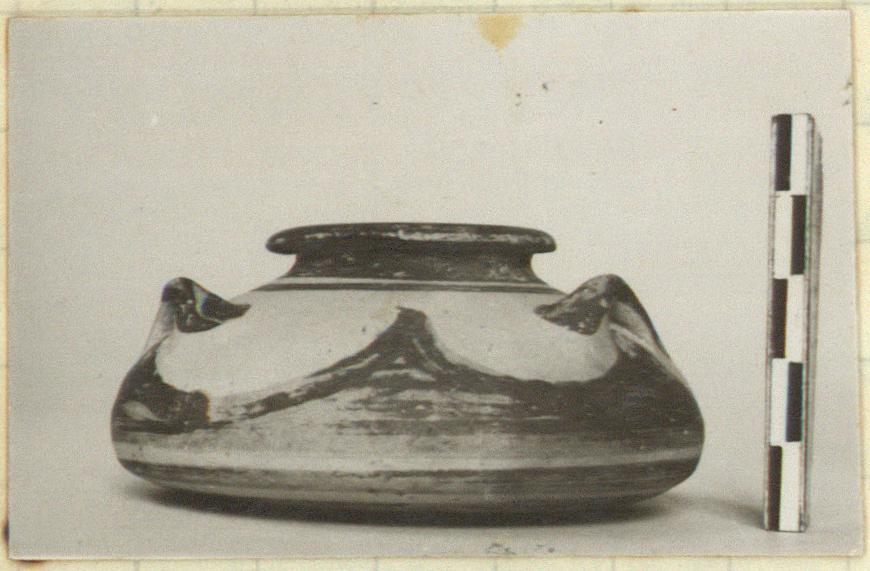 | Description: | Intact except for one handle missing. Squat body, projecting rim rounded on top; bottom flat. Lip and handles glazed; a broad band on the neck above a narrow band on the shoulder; then wave pattern with a crest beneath each handle and in the panels between. On the underside two concentric bands near the outer edge, and three at the center; all neat. Buff clay; smooth light buff slip; red glaze. | |