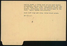 Description:   Mended from many pieces; complete except for small wall fragments, but the body badly warped so that the fragments at mid-body do not join properly. Body rounded above, then tapering to raised base, slightly depressed beneath. Tubular spout, rising vertically from the top. At the center above, rolled basket handle, centerd and not touching the spout. Decoration: on the handle, slanting stripes between narrow bands; a broad band around each handle attachment, and an oval loop enclosing the two. On the body, wavy lines, alternately single and double, vertically from the handle-band to the foot. Spout banded horizontally.