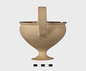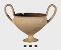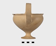 | Description: | Complete except for chip from foot and lip. Mended from three pieces. Narrow offset out-turned lip; two high-swung ribbon handles; very deep tapering bowl. Short stem, double-concave in profile; thin sloping foot, concave beneath. Pale buff clay; smooth light buff slip. The exterior unglazed, the interior glazed all over in horizontal sweeping strokes; red-brown glaze. | |
