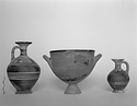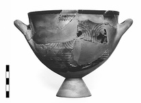 | Description: | Part of rim, one handle, and most of wall profile preserved; mended from nine fragments; three small pieces do not join. Thin walls; slightly flaring lip, relatively deep rounded bowl; horizontal loop handle, flaring. Glazed inside, reserved band at top inside lip. Outside lip, medium band; below, thin band and zigzag. Handle zone: compass-drawn series of four concentric circles, maltese cross inside. Below, four narrow bands, then solid glaze. A band on the handle, and a tail to either side. Yellow-buff clay, black glaze. Discoloration from burning. Cf. P 6673, P 6846. | |