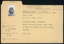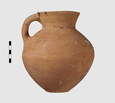 | Description: | Mended from eight pieces. Small parts of mouth and fragment from body missing. Surfaced. Buff clay. | |