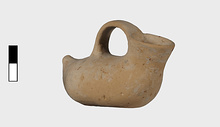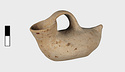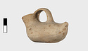 | Description: | Intact; surface damaged. Elongated, tailed, flat below. Wide spout; flat handle from lip to about the middle of the body. Cream slip. Most of painted decoration gone. Rim and handle once painted. Running dog pattern runs on the upper part, from the tail, around the base of the spout and back again. Band around the elliptical bottom. | |