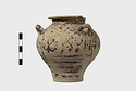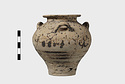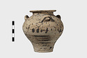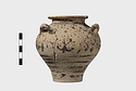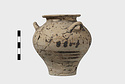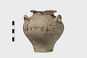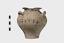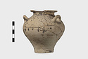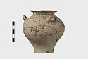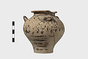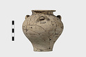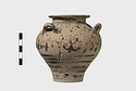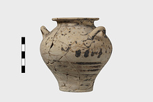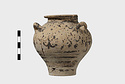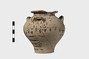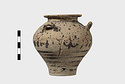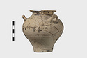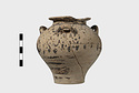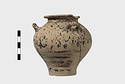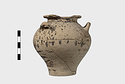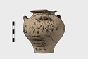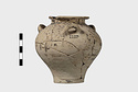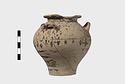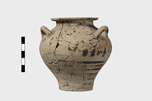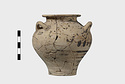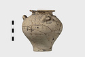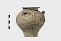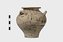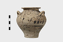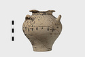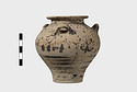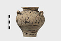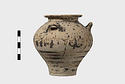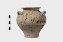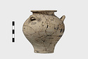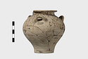 | Description: | Mended from twenty-two pieces; small pieces from rim and walls missing. Flat rim; almost straight, low neck. Rim, neck, handles painted. The upper part of the body is covered with dotted scale pattern, the rest with bands. Yellow clay. | |