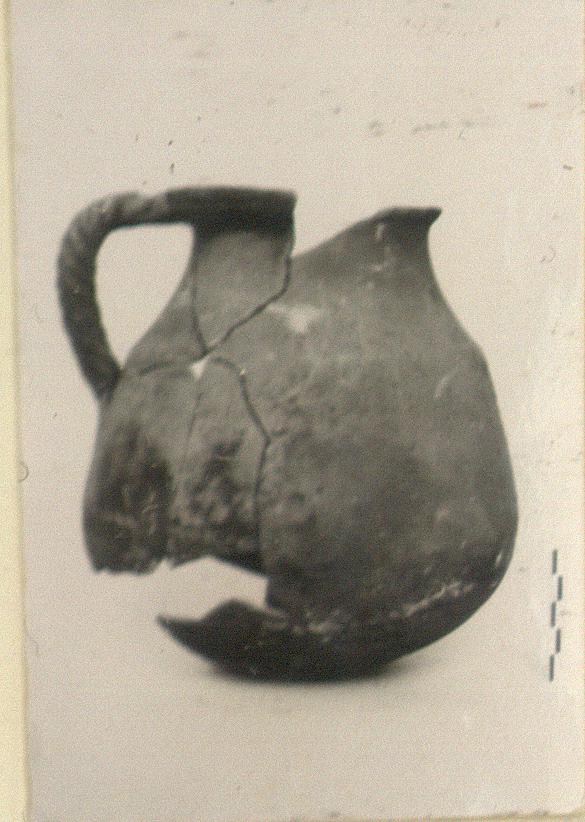 | Description: | Large fragments missing from body and rim. Twisted handle. Gritty brown clay, blackened from use. ADDENDA Found broken [December 1956]. Restored in plaster [May 1958]. | |