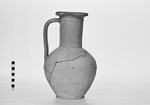 Description:   Chip from lip and fragments of wall missing. Ring foot; plump ovoid body; tall neck with light handle ridge; round mouth with sharply projecting lip; band handle with a single rib.