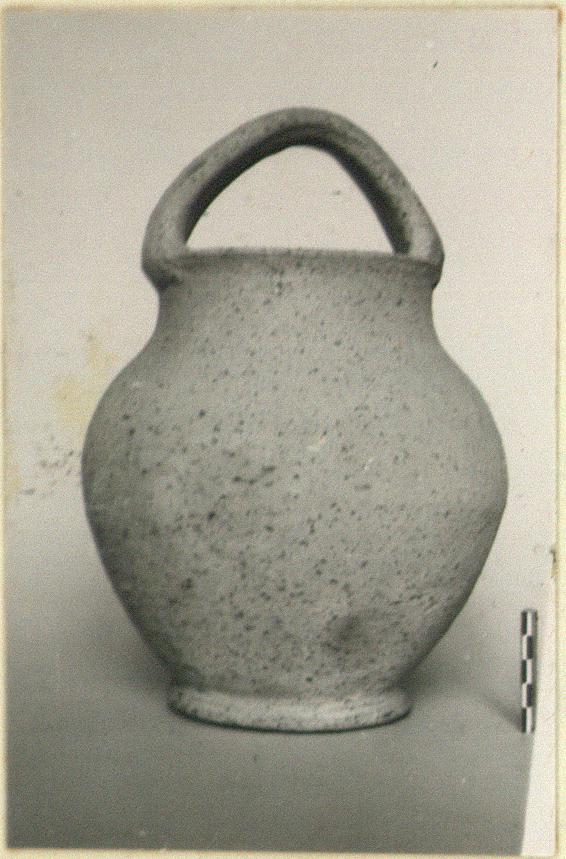 | Description: | Intact. Ring foot; plump ovoid body forming continuous curve with short wide mouth; lip very slightly thickened; handle bent to a sharp angle. Coarse gritty clay; greenish-white surface. | |