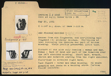 | Description: | Mended from six fragments; one non-joining wall fragment probably belongs. Two-thirds of bowl including the handles and part of bottom missing. Whole profile preserved. Figured scene of one side only: male and female figures. Woman with back of head and part of the himation over the left shoulder missing. Short hair, wreath, chiton and himation leaving free the right shoulder. Flute case in extended right hand. Male figure: torso and head missing. He wears himation and leans on a walking stick. Partial relief contours. If the non-joining fragment belongs, then part of a figure dressed in chiton and himation, to right, is preserved from side B. Reserved ground line; reserved groove at the junctιon of ring base. Resting surface reserved. Bottom washed red with two concentric circles and dot in the center. Added from sherds: one handle, and most of the draped female figure on the reverse. | |