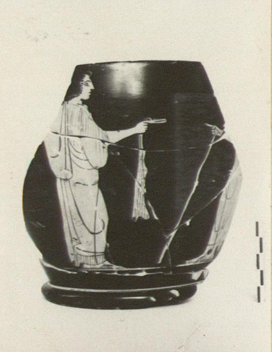 | Description: | Mended from six fragments; one non-joining wall fragment probably belongs. Two-thirds of bowl including the handles and part of bottom missing. Whole profile preserved. Figured scene of one side only: male and female figures. Woman with back of head and part of the himation over the left shoulder missing. Short hair, wreath, chiton and himation leaving free the right shoulder. Flute case in extended right hand. Male figure: torso and head missing. He wears himation and leans on a walking stick. Partial relief contours. If the non-joining fragment belongs, then part of a figure dressed in chiton and himation, to right, is preserved from side B. Reserved ground line; reserved groove at the junctιon of ring base. Resting surface reserved. Bottom washed red with two concentric circles and dot in the center. Added from sherds: one handle, and most of the draped female figure on the reverse. | |