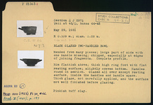 Description:   Mended from many pieces; large part of side with one handle missing; chipped, especially at edges of joining fragments. Complete profile. Restored in plaster. Rim flattish above; thick high ring foot with flat resting surface; slightly convex bottom. Handles round in section. Glazed over all except resting surface, inside the handles and handle space. Thick glaze, not carefully applied, and the surface not well finished before glazing.