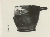 Description:   Attic type; mended from three pieces, large part, including the one handle, missing. Glazed over all except reserved groove at the junction of foot; resting surface, bottom with three small concentric circles and dot in center of bottom. Glaze unevenly fired and partly worn.