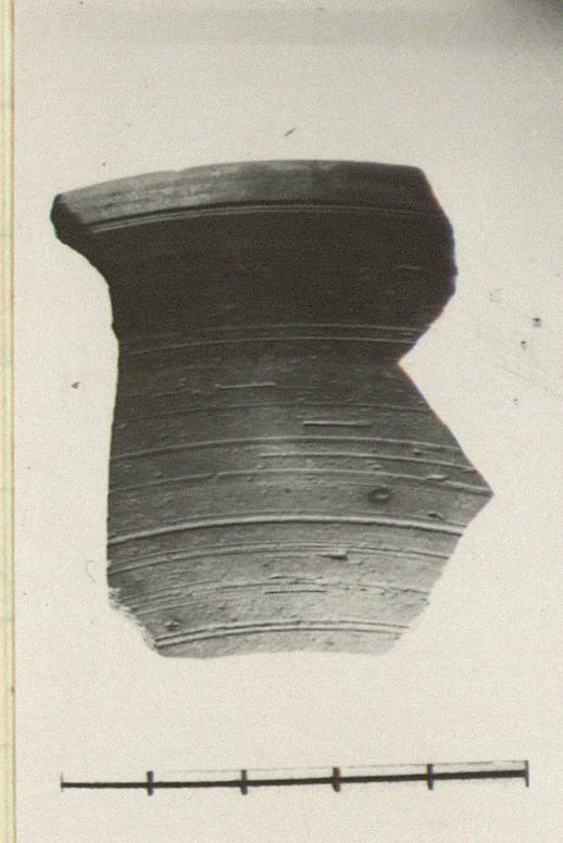 | Description: | Single fragment gives some of rim and upper body. Plain rim, bordered below by a groove both inside and outside. Two bands of rouletting on floor. Cinnamon clay; firm glaze. | |