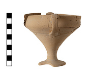 | Description: | Mended from many pieces. Nearly complete; fragments from lip and foot missing. Two small vertical band handles. Slightly offset lip; narrow bowl; slightly sloping spreading foot with a shallow depression underneath. Unglazed; buff clay with bits. | |