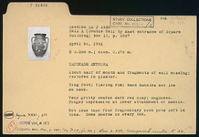 | Description: | About half of mouth and fragments of wall missing; restored in plaster. Ring foot; flaring rim; band handles set low on neck. Finger impression at lower attachment of handle. Very gritty coarse dark red clay. Unglazed. Handmade. Not less than four fragmentary such pots left in tins. Some sherds in every box. | |