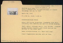| Description: | About two-thirds preserved; fragments from wall, including both handles and part of bottom, missing. Small pyxis; flat bottom; straight walls. Outside: glazed except reserved line below handles and another at the lower part. Pale buff clay. Late Protocorinthian(?). Other fragmentary pyxides left in tins. | |