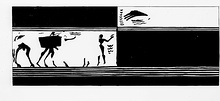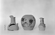 | Description: | Neck, handle and part of body missing. Restored in plaster. Very low base, flat underneath; ovoid body. Above a black base and four horizontal lines, at the lower part the decoration is in panels set in checkerboard pattern. Body panel: three men and an animal, probably horse; field ornament; shoulder panel: running animal; field ornaments; three lines divide the shoulder from the body. Bottom reserved. Attic clay. Glaze ranges from reddish to black, partly worn off. | |
