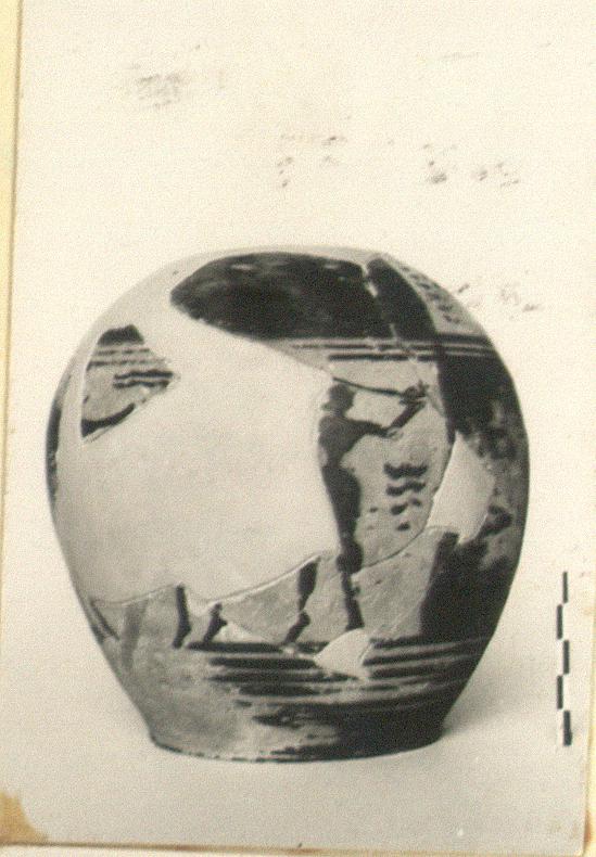 | Description: | Neck, handle and part of body missing. Restored in plaster. Very low base, flat underneath; ovoid body. Above a black base and four horizontal lines, at the lower part the decoration is in panels set in checkerboard pattern. Body panel: three men and an animal, probably horse; field ornament; shoulder panel: running animal; field ornaments; three lines divide the shoulder from the body. Bottom reserved. Attic clay. Glaze ranges from reddish to black, partly worn off. | |