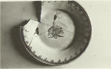 | Description: | Fragments of rim missing. Mended from six pieces. Decoration in blue-gray: lines around rim from which hang groups of dots; in center a floral design. Light buff clay, grayish white glaze. | |