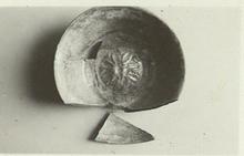| Description: | Mended form several pieces; fragments of rim and body missing. At center of interior a raised boss with a rosette in low relief. Pink clay, light green(?) glaze, much discolored exterior and interior. Cf. P 2155. | |