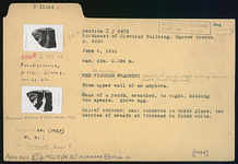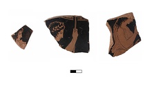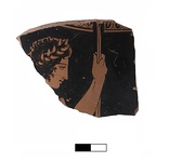 | Description: | From upper wall of an amphora. Head of a youth, wreathed, to right, holding two spears. Above egg. Relief contour; hair rendered in thick glaze; two berries of wreath at forehead in faded white. ADDENDA (Sept. 2020), according to Agora XXX, Pelike fragment. | |