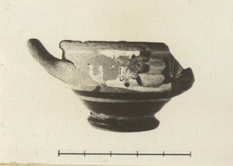 | Description: | About half of wall and most of one handle missing. Thickened rim, flaring walls, thick ring foot with angular profile; bottom raised in the center beneath. Long, incurving handles. The inside, the rim, the lower half (except a reserved band in upper part), the foot (except lower edge and bottom), the handles outside, are glazed. The zone between the handles is decorated with a figure(?) between upright palmettes in black figured technique on a white ground. Extremely bad drawing as usual in this group. Pinkish-buff clay; the white ground flaky. | |