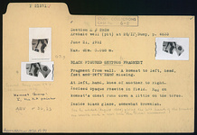 | Description: | Fragment from wall. A komast to left, head, feet, and left hand, missing. At left, hand, knee of another to right. Incised opaque rosette in field. Red on komast's chest runs down a little on the torso. Inside black glaze, somewhat brownish. ADDENDA One fragment added Aug. 1954 gives the left hand of the komast, one rosette and a scroll from the floral ornament. | |