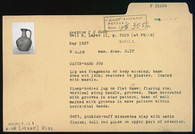 | Description: | Lip and fragments of body missing; base does not join; restored in plaster. Coated with mastic. Plump-bodied jug on flat base; flaring rim; vertical strap handle, grooved. Base decorated with grooves in star pattern; base of wall marked with grooves in wave pattern within horizontal bands. Soft, pinkish-buff micaceous clay with satin finish; dull red glaze on upper part of exterior | |