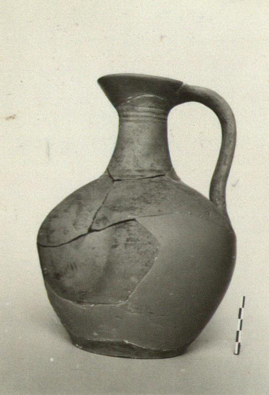 | Description: | Lip and fragments of body missing; base does not join; restored in plaster. Coated with mastic. Plump-bodied jug on flat base; flaring rim; vertical strap handle, grooved. Base decorated with grooves in star pattern; base of wall marked with grooves in wave pattern within horizontal bands. Soft, pinkish-buff micaceous clay with satin finish; dull red glaze on upper part of exterior | |