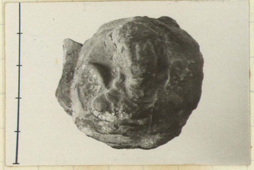 | Description: | Broken all around. From closed vessel. Head in high relief, turned slightly to left. Wings(?) on shoulders. Buff clay; black glaze of which much has rubbed off. Cf. P 20910: same representation but larger scale. | |