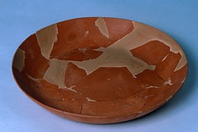 | Description: | Mended from many pieces, restored in plaster. Flat plate with flaring wall. Raised ridge at outer edge of floor serves as resting surface. Hard brick red clay, thin fabric; self-surfacing. Late Roman A. Cf. Agora XXXII, p. 72, n. 34. | |