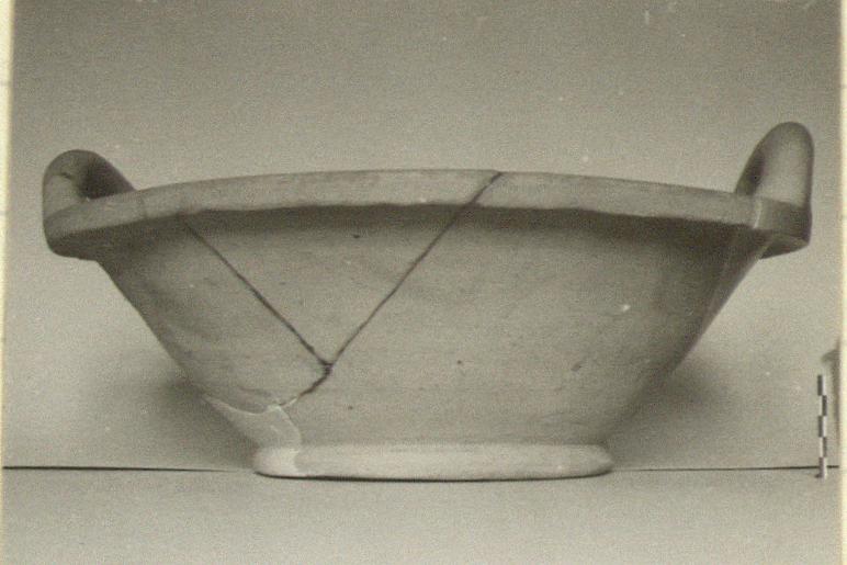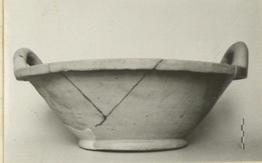 | Description: | Mended from several pieces. One side of wall, with all of one handle missing, and part of bottom. Restored in plaster. Open bowl with steep sides; substantial ring foot; projecting flat-topped rim slightly undercut and with vertical outer face. Rising from the top of the rim, heavy arched handle. Graffito neatly inscribed on the top of the rim: <graphic> Very soft pinkish-buff clay, light buff on the surfaces. | |