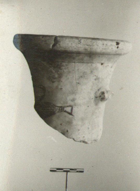 | Description: | About half of mouth and neck preserved and one handle stub, of a large amphora with thickened rounded rim. On one side of the neck, a bird to left, in outline, with checkerboard wing. Soft pink to gray fabric with buff surface. Thin glaze, worn, on outside of rim. | |