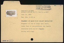 | Description: | Fragment of rim of large open basin. Outer face of rim profiled; one fascia decorated with relief tongues. Gritty buff clay. | |