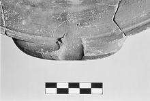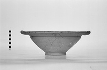 | Description: | Fragmentary; profile complete; plastered. Deep bowl; ring foot; flaring wall; everted rim and overhanging lip grooved on top and outer edges; two horizontal handles applied flush to lip. Hard, coarse, buff clay. Dull glaze applied in swirls in exterior, red and mottled black. | |