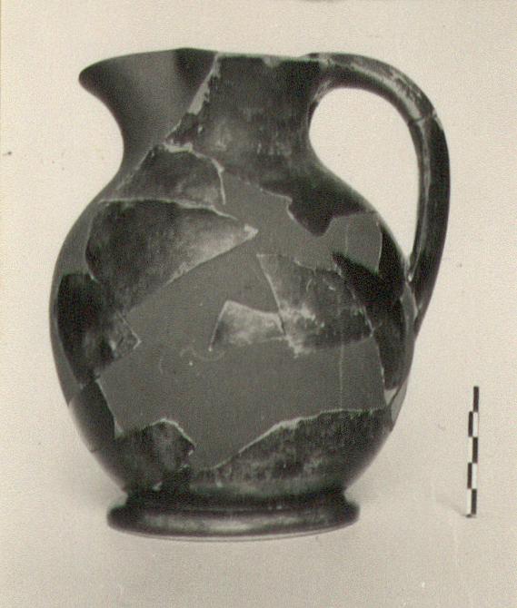Description:   The base is preserved complete, and portions of the walls, handle, and lip. Restored in plaster. Echinus foot, its inner face convex. The underside of the floor is completely reserved and reddened; its surface is finely smoothed. The outer surface of the handle is convex with a slight central ridge, the inner flat. There is a continuous curve from the body through shoulder and neck to trefoil lip. All extant portions of the exterior, and the interior of the mouth are painted in black glaze, in places worn to a dull brown flecked with red. Interior of body thinly coated with glaze that varies from black to brown.