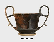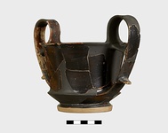 | Description: | More than half complete; missing fragments of body, rim and handles. Restored in plaster. Foot in two degrees, the lower disc-like, the upper spreading; the angle at which they meet is an echo of that in the walls above; flat resting surface; inner face of foot slopes up steeply to meet underside of floor, which is convex. The body consists of a short spreading lower wall and a slightly concave upper wall that join to form a sharp keel from which the handles spring. The outer edge of the rim is slightly rounded. Strap handles, rising in a loop above the rim. There is a cross-piece between rim and handle, and a finger rest on the outside of each handle near its lower attachment. Thin fabric. Black glaze inside and out except as follows: the lower degree of the foot is reserved as well as the resting surface; inner face of foot glazed but underside of floor reserved and bears two concentric glazed bands. The glaze fired brownish-black to dull red, peeled in places, particular on one handle. . | |