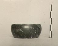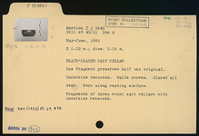 | Description: | One fragment preserves half the original. Underside recessed. Walls convex. Glazed over all; worn along resting surface. | |