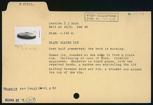 | Description: | Over half preserved; the knob is missing. Restored in plaster. Domed lid, rounded at the edge to form a plain rim. Thickening at root of knob. Interior unpainted. Exterior in black glaze, with two reserved bands, a narrow one encircling the lid halfway between knob and rim, a broader one around the top of the rim. Cf. Agora XII, no. 1219. | |