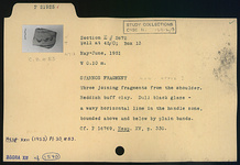 | Description: | Three joining fragments from the shoulder. A wavy horizontal line in the handle zone, bound above and below by plain bands. Reddish-buff clay. Dull black glaze. Cf. Agora XII, no. 1540. Cf. P 16769, Hesperia 15 (1946), p. 330. Non-Attic? | |