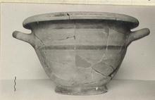 | Description: | Missing only a few fragments of body. Spreading ring foot, its inner face rising in a concave curve to join the flat underside of the floor. Horizontal handles, slightly uplifted. Rounded projecting rim, ending outside below in a thin sharp edge. Dull glaze, black inside, brown outside, variously faded, worn, or peeled, covers all the interior, including upper surface of rim, and is used also on the exterior in simple bands above and below the level of the handle roots, and on the outside of the foot. Pale brown fabric. Some suggestion, on the exterior, of a pale brown wash. Inside where the glaze has peeled the surface is pink. Cf. Agora XII, no. 1800. | |