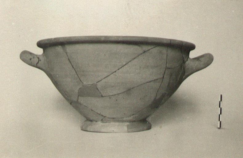 Description:   Missing a few fragments from base, walls, and rim; restored in plaster. Spreading ring foot, with angular profile. Horizontal handles, uptilted. Rim almost flat, its outer edge vertical. Glaze on interior and rim almost all peeled, exposing a pink surface. There is a smoothed band around the exterior below the level of the handle roots but it bears no trace of color. There is some indication of glaze at the junction of body and foot.