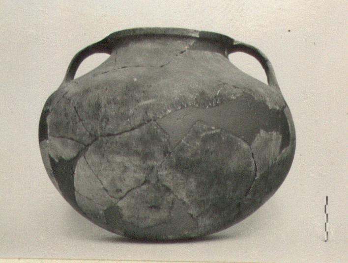 | Description: | Missing several fragments of body and rim; restored in plaster. Round bottom. Body bulging and lopsided. Gently sloping shoulder. Short concave neck. Flaring rim, with concave outer edge. Flat strap handles rooted in shoulder and rim. Coarse cooking ware fabric, sandy red to gray-brown. Surface much pitted. Marks of burning. | |