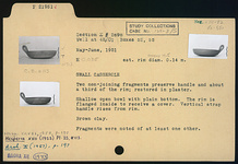 | Description: | Two non-joining fragments preserve handle and about one-third of the rim; restored in plaster. Shallow open bowl with plain bottom. The rim is flanged inside to receive a cover. Vertical strap handle rises from rim Brown clay. | |