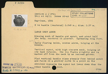 | Description: | Missing much of handle and spout, and about half the body; restored in plaster. Spreading ring foot. Body flaring below, convex above, bulging at the middle. Vertical spout, with high concave neck, bulging at its base outside. The lip flares slightly and is marked off from the neck by an incised groove. Flat vertical handle rises steeply from behind spout and falls in a gentler curve to a point on the shoulder opposite the spout but lower down than the other handle root. On the body beneath the handle is a small moulded nob with conical top, as if to suggest a lid. The illusion is reinforced by two incised grooves describing a partial circle, beginning and ending on opposite sides of the lower handle root. The grooves become indistinct in the space between spout and handle. Slate gray fabric, the surface of darker color than the interior. | |
