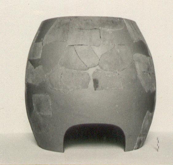 | Description: | Missing fragments of base, most of rim, and much of body; restored in plaster. Barrel-shaped stand, open at each end. At the bottom the walls are thickened and rounded to provide a resting surface. At the top, a plain flat rim, with a small bevel at its inner edge. Coarse brown fabric. The interior shows marks of burning at top and bottom. Cf. Agora XII, no. 2023. | |